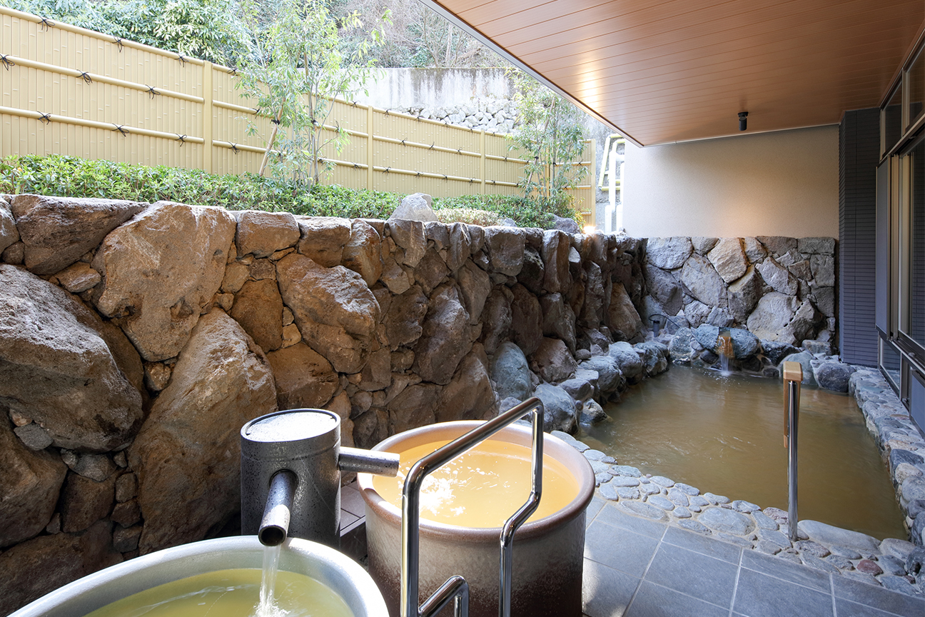 肌に柔らかな自家源泉、そして有馬の名湯「金泉」は、大浴場にてお楽しみいただけます。岩風呂・釜風呂にてご用意。自然を感じながら、ゆったりとおくつろぎいただけます。